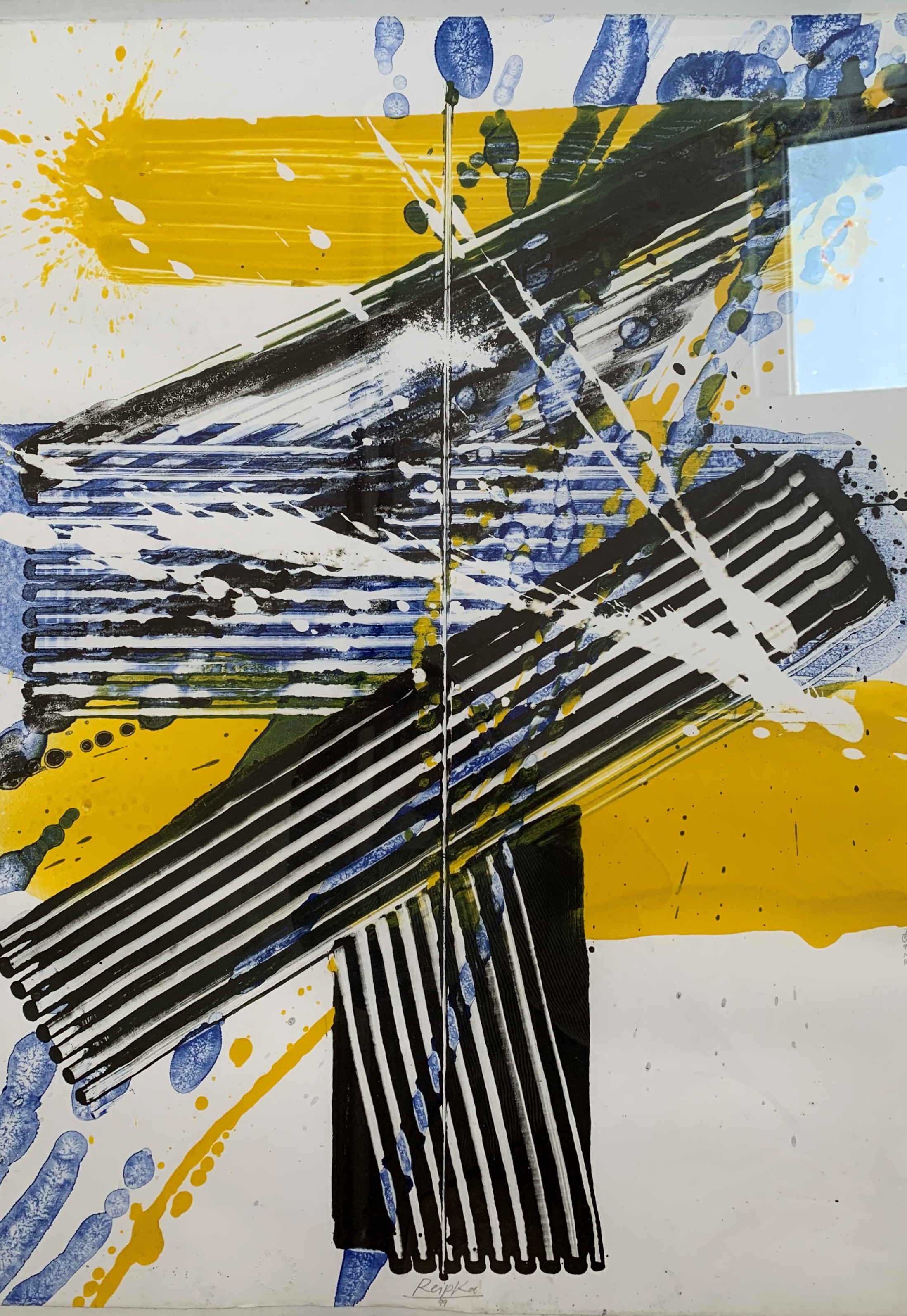 In seiner typischen Manier komponierte Reipka seine Bilder: Zunächst ließ er mit einem in Farbe getränkten Pinsel Tropfspuren in Form von Spritzern, Klecksen und Linien über den Malgrund auf die Vorderseite der Leinwand fallen. Mit Hilfe von kammartigen Schabern schaffte er zusätzliche Strukturen und Transparenzen. Diese Reihungen und Schichten waren, wie er selbst sagte, seine wichtigsten Prinzipien. Seine Bilder, Gouachen oder Glasmalerei leben von dieser Spannung der geometrischen Balken und der farblichen Präsenz.